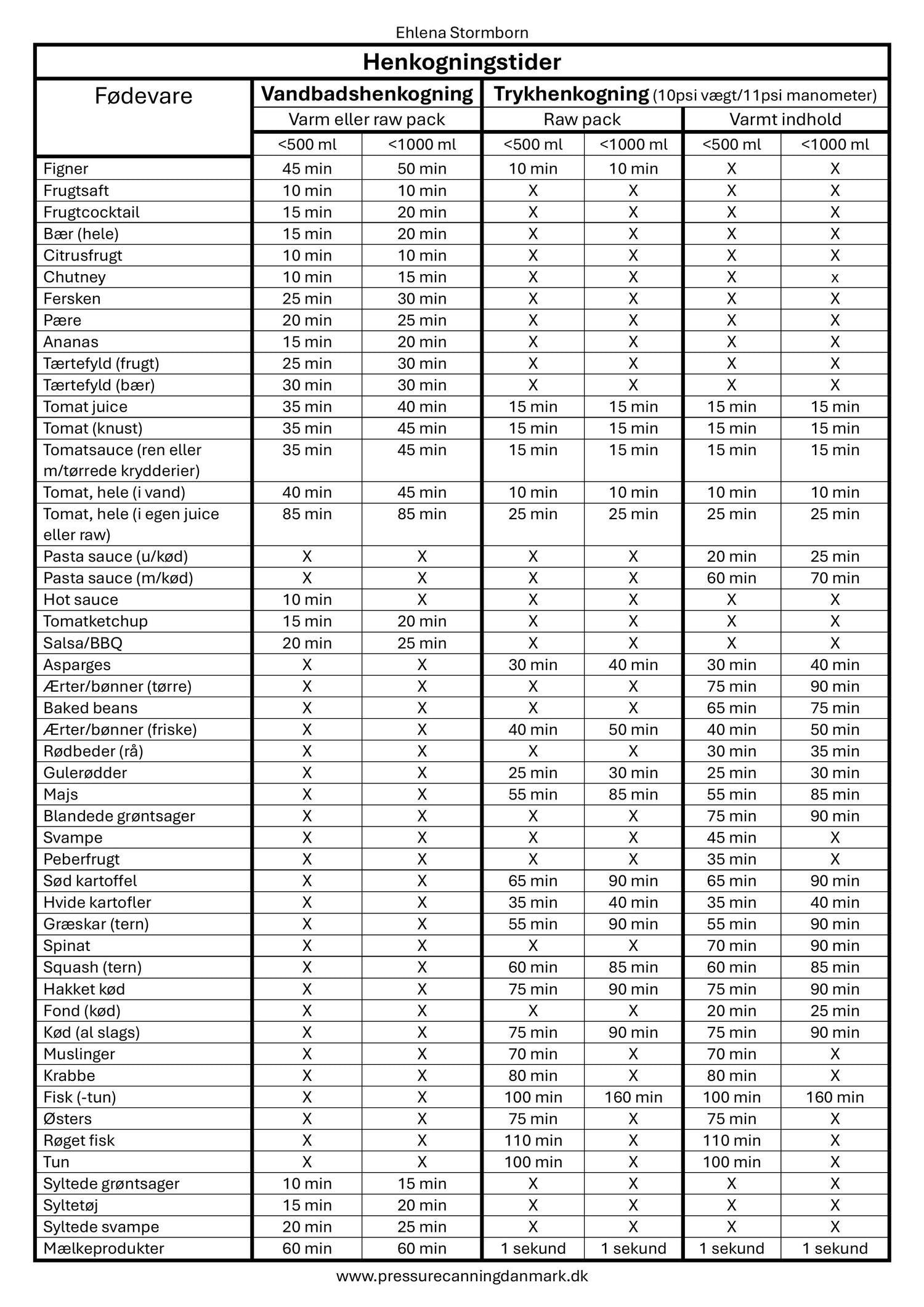 Skemaet er angivet såeledes at det skelner mellem hvilken type henkogning der kan bruges; vandbadshenkogning eller trykhenkogning (i visse tilfælde kan begge dele bruges).