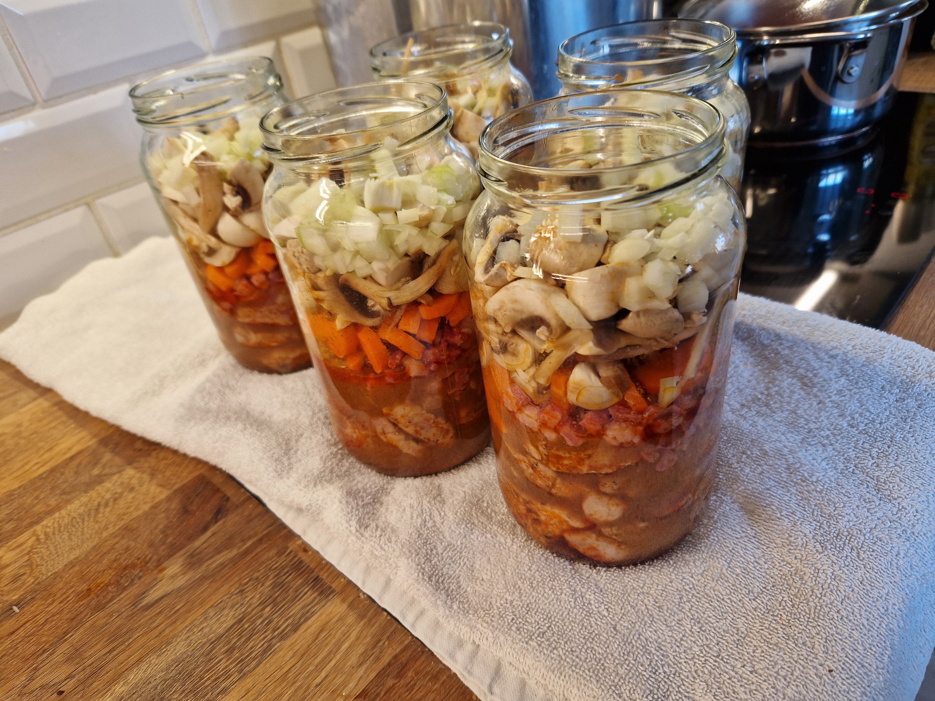 Klargøring af mørbradgryde på glas, inden væske er tilsat og inden de er blevet trykhenkogt. Lækkert kød med gulerødder, champignon, bacon og løg der venter på en tomat sauce tilsat oksefond så hele glasset blot skal tilsættes 2,5 dl fløde ved opvarmning.