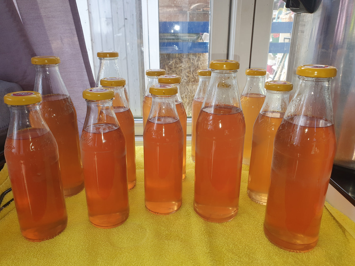 Vindruesaft kogt i saftkoger, tilsat sukker og damphenkogt for at have frisk, sød saft året rundt som bare skal tilsættes vand for at være drikkeklar.